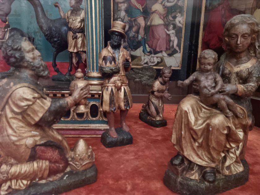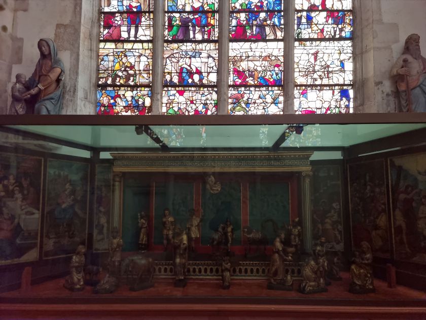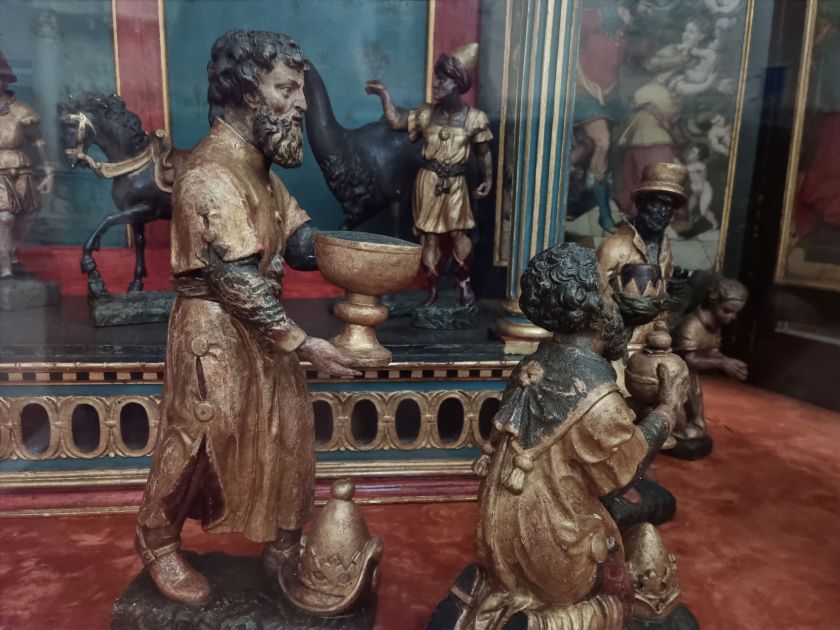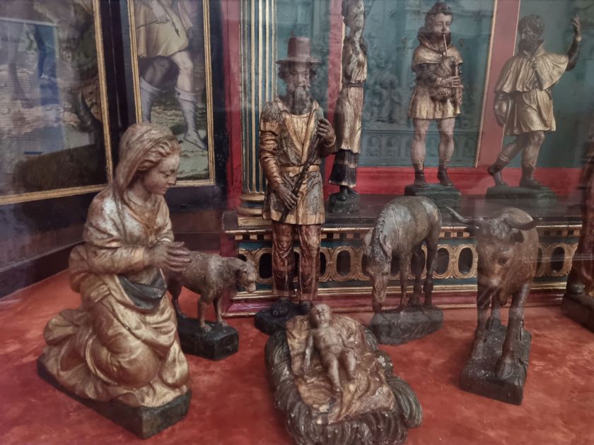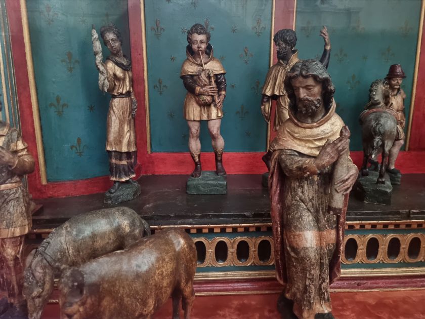 Creșa din lemn aurit din secolul 16, prezentată într-un dulap cu panouri pictate formând un poliptic, conține douăzeci și două de statuete cu o destinație neașteptată.